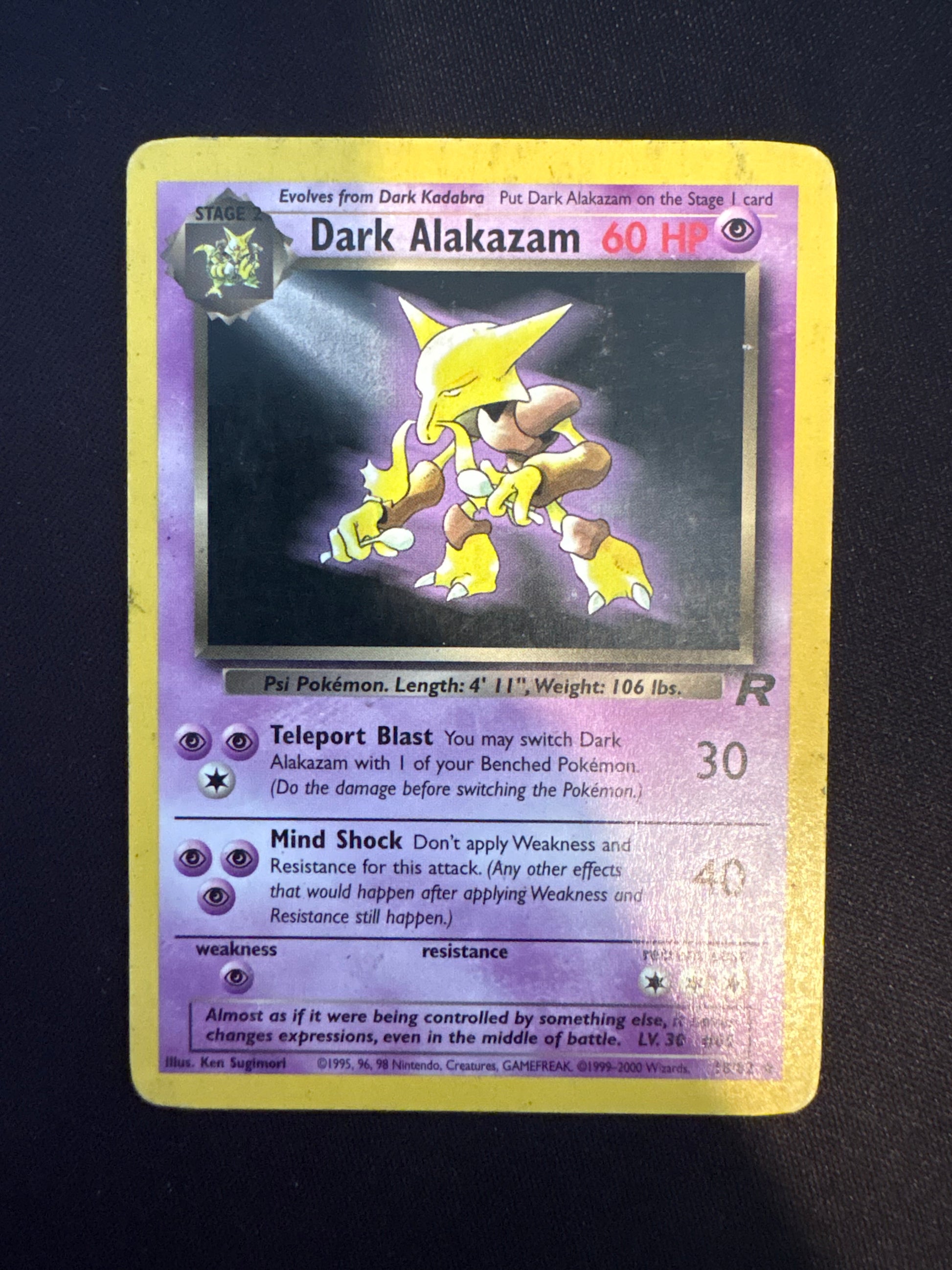 Dive into the Kanto region with this iconic Dark Alakazam from the Rocket set! This legendary Pokémon card features stunning artwork, making it a prized addition to any collection.