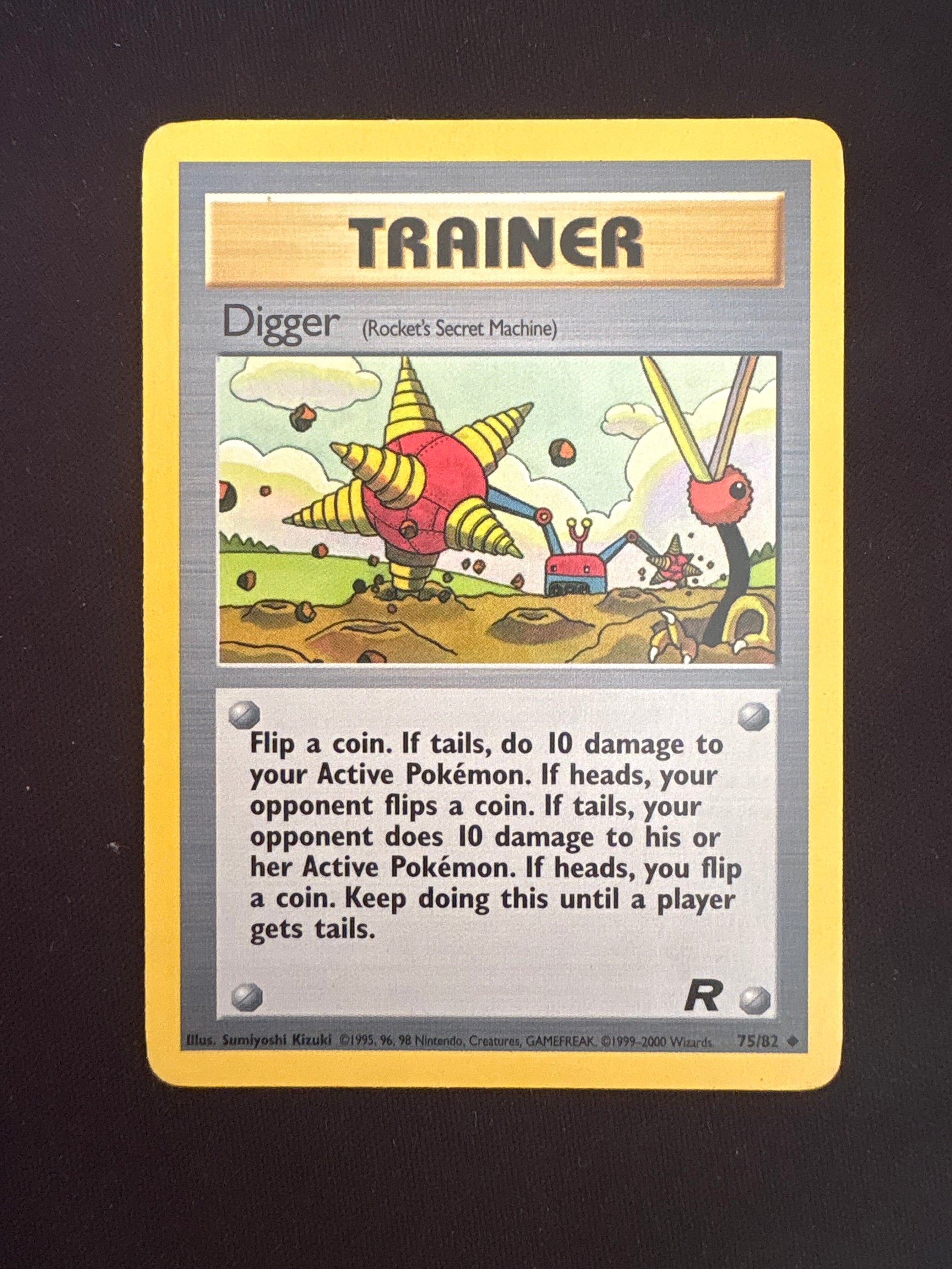 Check out this iconic Trainer card Digger from the rocket set! This legendary Pokémon card features stunning artwork, making it a prized addition to any collection.